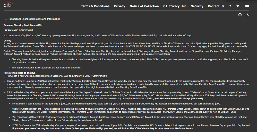 The offers they had was $300, $700, $1,500 for people that never had an account with Citi bank or had an account, but was closed for over two years. You will have to deposit money into the account within 20 days and depending on the amount that you deposit will determine the offer you receive. After the 20th day it will be locked in to the eligible offer you qualify for, then you will have to leave it in for additional 60 day after the 20th day. Then after that time frame it will be deposited into the account.